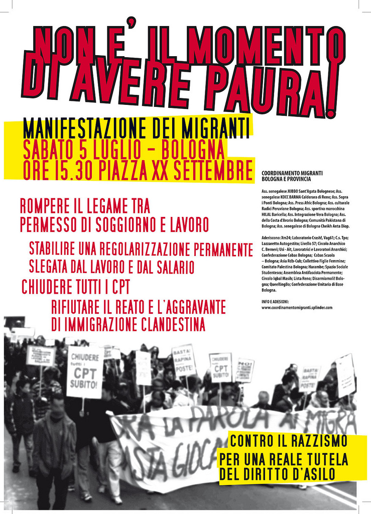 La manifestazione si è conclusa dopo circa tre ore in piazza re Enzo lanciando una campagna orientata a promuovere una giornata di sciopero del lavoro migrante ed una grande manifestazione antirazzista nazionale a Roma il prossimo 4 ottobre.