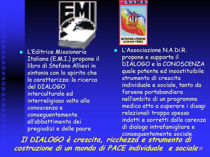 "associazione a carattere socio-sanitario destinata alla cura e alla prevenzione dei Disturbi del Comportamento alimentare (anoressia, bulimia, obesità), inquadrabili nei Disturbi di Relazione, attraverso un'azione diretta sul territorio nazionale con allargamento nel Sud del Mondo attraverso missioni di interscambio "