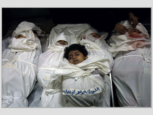 Tramite queste conferenze stampa stanno dichiarando al mondo che gli obbiettivi delle bombe sono solo terroristi di Hamas, e non quei bambini orrendamente mutilati che tiriamo fuori ogni giorno dalle macerie. A Zetun, una decina di chilometri da Jabaliya, un edificio bombardato è crollato sopra una famiglia, una decina le vittime, le ambulanze hanno atteso diverse ore prima di poter correre sul posto, i militari continuano a spararci a contro. Sparano alle ambulanze, bombardano gli ospedali. Pochi giorni fa una «pacifista» israeliana mi avevo detto a chiare lettere che questa è una guerra dove le due parti contrapposte utilizzano tutte le loro armi a disposizione. Invito allora Israele a sganciarci addosso una delle sue tante bombe atomiche che tiene segretamente stivate contro tutti i trattati di non proliferazione nucleare. Ci tiri addosso la bomba risolutiva, terminino l'inumana agonia di migliaia di corpi maciullati nelle corsie sovraffollate degli ospedali che ho visitato. Ho scattato alcune fotografie in bianco e nero ieri, alle carovane di carretti trascinati dai muli, carichi all'inverosimile di bambini sventolanti un drappo bianco rivolto verso il cielo, i volti pallidi, terrorizzati.