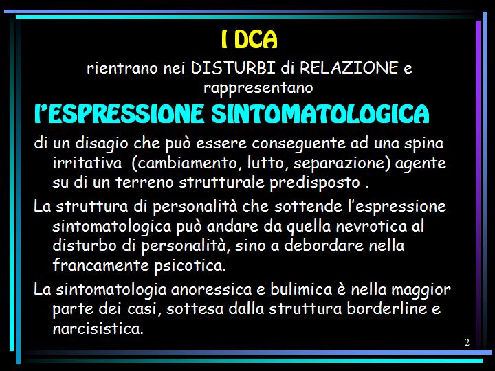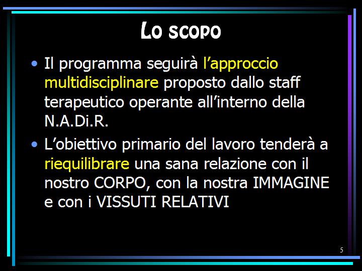 "associazione a carattere socio-sanitario destinata alla cura e alla prevenzione dei Disturbi del Comportamento alimentare (anoressia, bulimia, obesità), inquadrabili nei Disturbi di Relazione, attraverso un'azione diretta sul territorio nazionale con allargamento nel Sud del Mondo attraverso missioni di interscambio "