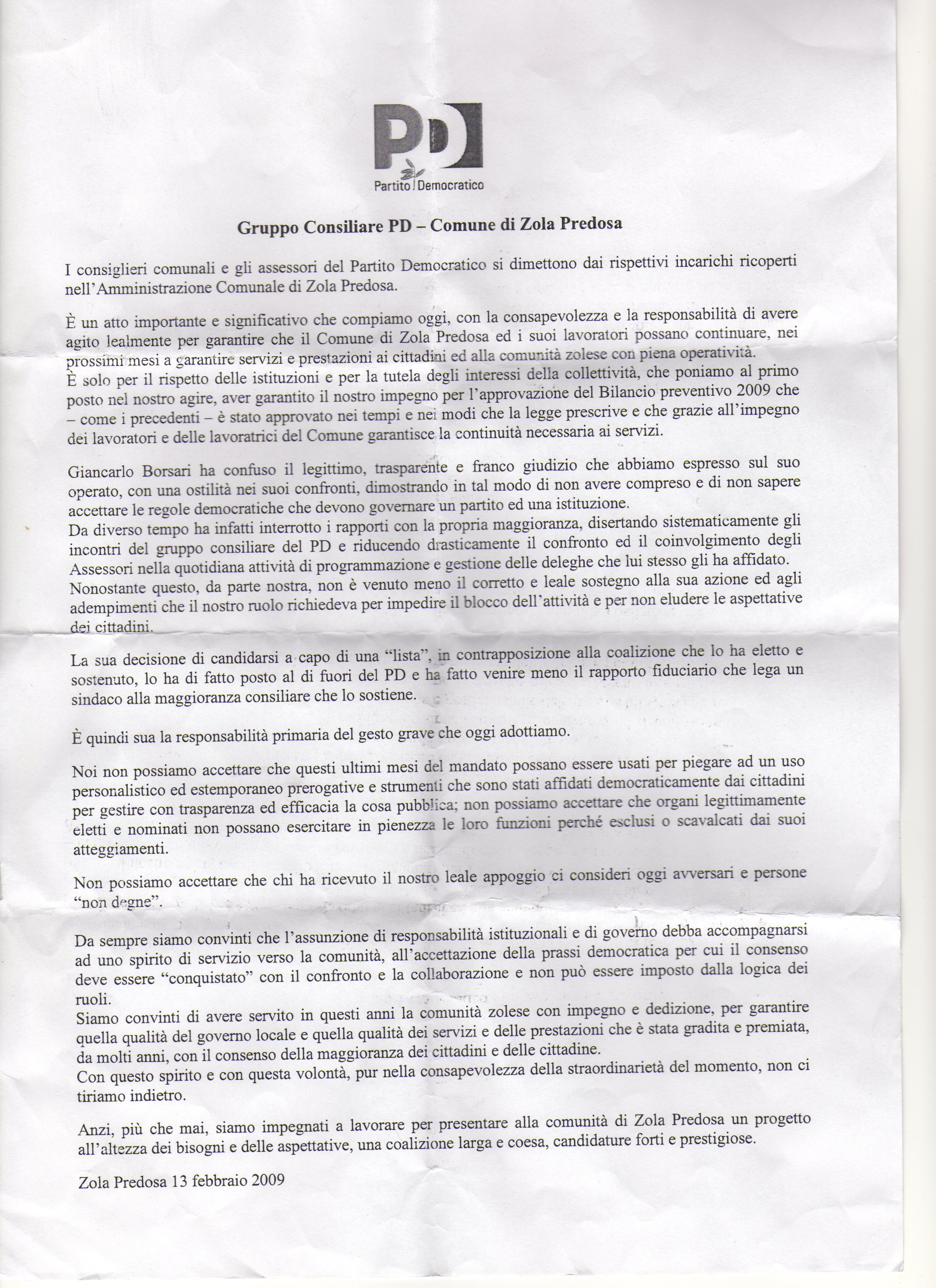 Giancarlo Borsari, Sindaco uscente del Comune di Zola Predosa (Bo), intervenendo all'Assemblea pubblica espressione di cittadinanza attiva tenutasi il 24 febbraio '09 c/o la Sala Arengo del Municipio, amareggiato per ciò che sta vivendo negli ultimi mesi sopratutto se posto in relazione con la sua stessa ideologia socio-politica adesa al messaggio originale del PD di cui lui stesso fu parte dell'organismo fondatore, vuole chiarire ai cittadini, come sua consuetudine, le posizioni.