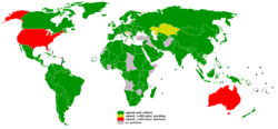 Adesione al Protocollo di Kyoto nel 2005. In verde gli stati che hanno firmato e ratificato il trattato, in giallo gli stati che lo hanno firmato ma non ancora ratificato. Australia e Stati Uniti hanno firmato ma hanno poi rifiutato di ratificare il trattato.