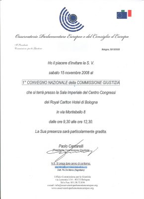 Presso la Sala Imperiale del Centro Congressi del Royal Carlton Hotel di Bologna in via Montebello 8, dalle ore 9,30 alle ore 12,30 del 15/11/2008, verrà effettuato il “ 1° Convegno Nazionale della Commissione Giustizia ” con la partecipazione di tutti gli appartenenti alla Commissione Giustizia: