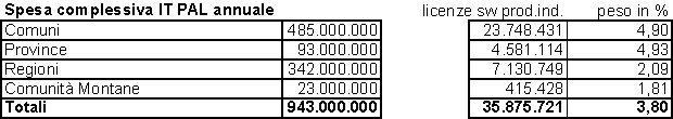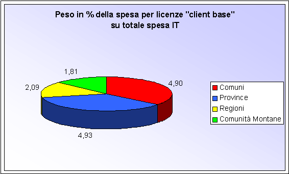 Rapportando il volume di spesa in licenze d'uso per prodotti “ client base ” (Tab. 4) alla spesa totale in Information Technology (IT) della Pubblica Amministrazione Locale italiana, si vede come Comuni e Province destinano al pagamento di licenze “base” quasi il 5% della propria spesa totale IT; le Regioni si attestano intorno al 2% della propria spesa totale, mentre le Comunità Montane rimangono al di sotto di tale soglia con un 1,81%.